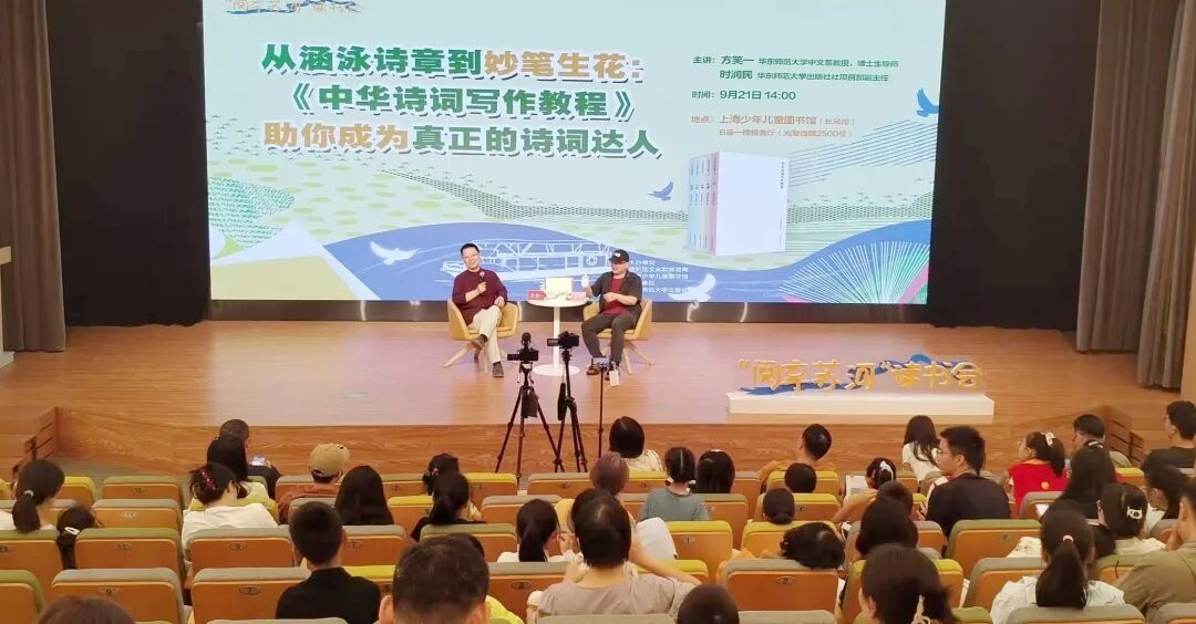 9月21日,普陀区亲子阅读品牌“阅享苏河”读书会第二期活动举办。本期主题为“从涵泳诗章到妙笔生花:《中华诗词写作教程》助你成为真正的诗词达人”,特邀华东师范大学中文系教授、唐宋文学研究专家、央视《中国诗词大会》命题人方笑一和华东师范大学出版社项目部副主任、《中华诗词写作教程》责任编辑时润民,围绕新书《中华诗词写作教程》,深入探讨诗词艺术的文化底蕴及其对当代生活的意义,带领观众回顾了近几十年来古诗词推广的历程。
